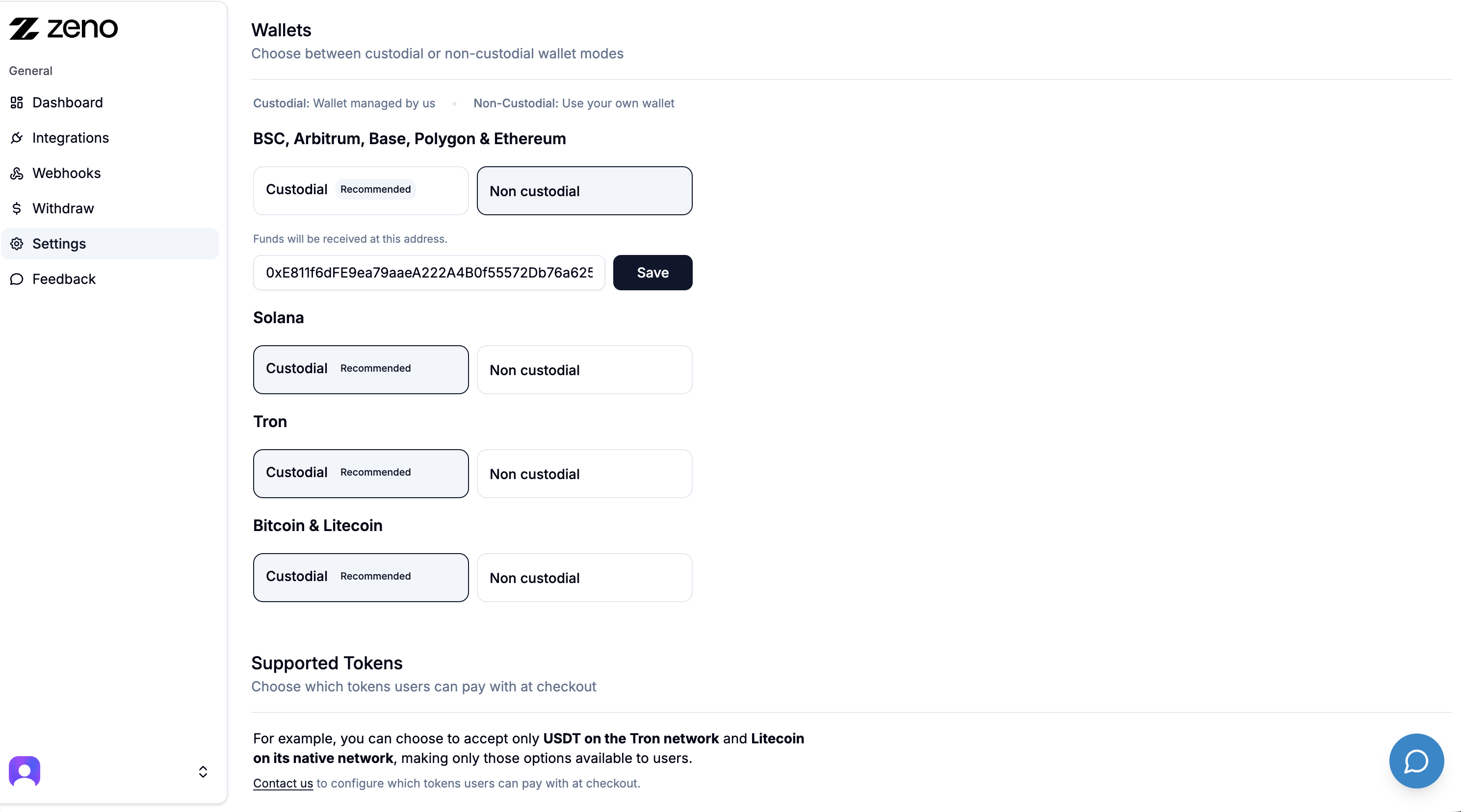 For On Chain payments (Arbitrum, Base, Ethereum, etc.), choose between Custodial and Non Custodial mode.